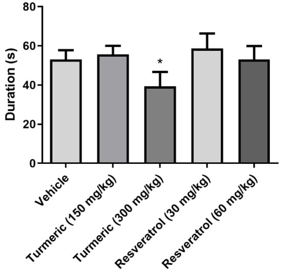Duration of the first generalized seizure. The 300 mg/kg of turmeric group decreased the duration of the first generalized seizure compared to the vehicle group. Data were analyzed by one-way ANOVA one-way, followed by Tukey’s multiple comparison test. Data are expressed as the mean ± standard error. * p < 0.05 vs. the vehicle group.