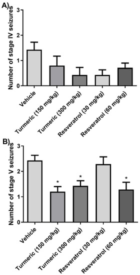 Number of (A) phase IV and (B) phase V generalized seizures. The 150 and 300 mg/kg of turmeric and 60 mg/kg of resveratrol groups decreased the number of phase V generalized seizures compared to the vehicle group. Data were analyzed by one-way ANOVA, followed by Tukey’s multiple comparison test. Data are expressed as the mean ± standard error. * p < 0.05 vs. the vehicle group.