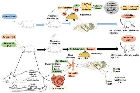 Finally, although this study did not explore the mechanism by which chronic oral administration of turmeric and resveratrol produces an anticonvulsant effect against lithium–pilocarpine-induced SE, it is suggested that these effects could be related to protection against possible damage that generates seizures. In this sense, pilocarpine reaches the CNS and acts as an agonist of the muscarinic receptors M1 and M2, both coupled to Gq proteins [42]. Activation of the M1 receptor has convulsive effects [43,44]. The M1 receptor is located on pyramidal cells in the CA1 and CA3 regions of the hippocampus and in some interneurons. In CA1, the M1 receptor colocalizes with N-Methyl-D-Aspartate (NMDA) receptors [45]. When pilocarpine binds to the M1 receptor, phospholipase C is activated, producing inositol triphosphate (IP3) and diacylglycerol (DAG). IP3 promotes the release of intracellular Ca++ from internal stores, mainly from the endoplasmic reticulum. The intracellular increase in calcium promotes the release of glutamate, which produces seizures and induces SE [46].