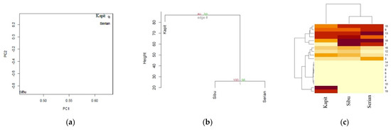 The multivariate statistical analysis revealed interconnected correlation patterns among the fatty acid composition (%) found in the kernel, pulp, and skin fractions of dabai fruit oil from different localities. (a) PCA based on the correlation matrix of fatty acids (%); (b) A consensus tree of the relationships among Sibu, Serian, and Kapit in the fatty acids (%). The Pvclust package in R was used to cluster these traits according to the Euclidean distance matrix. The numbers at the forks were the percentages of approximately unbiased (AU; in red) p-values and bootstrap probabilities (BP, in green), estimated from 1000 bootstrapping samples; (c) A heatmap showing cluster groups in both the fatty acids (%) and different localities (Sibu, Serian, and Kapit). The numbers on the right side represent the codes for 19 fatty acids (%) found in the kernel, pulp, and skin fractions within three localities that showed a mixed pattern.