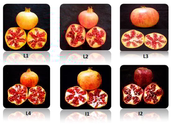 “Djeibi” (L1), “Mersi” (L2), “Sefri 1” (L3), “Sefri 2” (L4), “Mollar de Elche” (I1), and “Hicaz” (I2) pomegranate varieties.