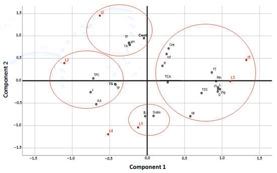 Principal component analysis (PCA) of selected varieties (L1, L2, L3, L4, I1, and I2) using fruit morphology and juice physico-chemical characters.