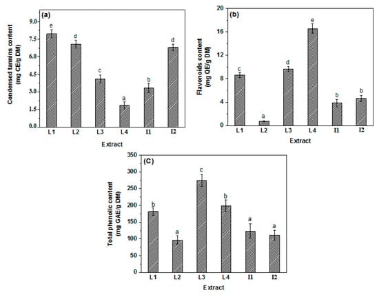 Condensed tannins (mg of catechin equivalent/g of dry matter) (a), flavonoids (mg of quercetin equivalent/g of dry matter) (b) and total phenolic compounds (mg of gallic acid equivalent/g of dry matter) (c) contents; values with different letters a, b, c, d, e for each graph are statistically different (Duncan test, p = 0.05).