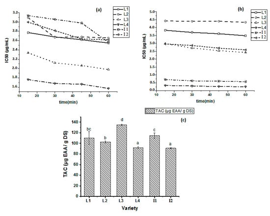 Antioxidant capacity of L1, L2, L3, L4, I1, and I2 varieties by DPPH• method (expressed as IC50 μg/mL) (a), ABTS•+ method (expressed as IC50 μg/mL) (b), and total antioxidant capacity (TAC) method (expressed as μg eq ascorbic acid/g dry sample) (c).