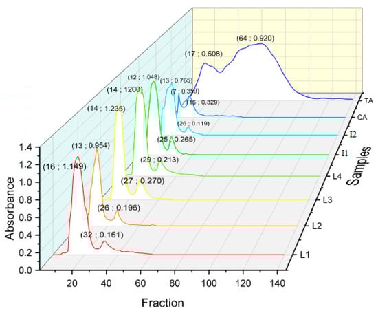 Comparing elution profiles in Figure 5, it can be concluded that the different rinds varieties highlight, qualitatively and quantitatively, differences in molecular distributions of tannins content. As reported in our previous work [], the smaller the fraction number, the highest the molecular weight. The profile contained two regions: the high mass fraction from 5 to 25 and the low mass fraction from 25 to 100, which has been reduced to a single high- and low-intensity peak for each extract. I1 exhibited the highest molecular weight (12; 1.048), followed by I2 (13; 0.765) and L2 (13; 0.954). Medium polymers size is attributed to L1 (16; 1.149), L3 (14; 1.235), and L4 (14; 1.200). The high molecular size peaks match with the elution profile of catechin (15; 0.329), which is the main monomer of condensed tannins polymerization []. Indeed, it can be concluded that PR extracts are characterized by the high molecular weight manifested by condensed tannins. Previous studies confirmed that pomegranate peel is characterized by the presence of high molecular weight phenolics, such as ellagitannins and proanthocyanidins []. On the other hand, the tannic acid elution profile illustrated a self-polymerization in time showing a slow elution within Sephadex gel beads, translated by the small size of molecules. For that reason, it is worth noting that extracts obtained from L1, L2, L3, L4, I1, and I2 all have high molecular sizes of condensed tannins, which could be valued as potential agents in environmental applications [].