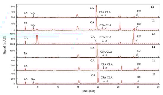 HPLC-DAD chromatograms of L1, L2, L3, L4, I1, I2 PR extracts. TA—tannic acid; GA—gallic acid; CFA—caffeic acid; CLA—chlorogenic acid; CA—catechin; RU—rutin recorded at 250 nm.