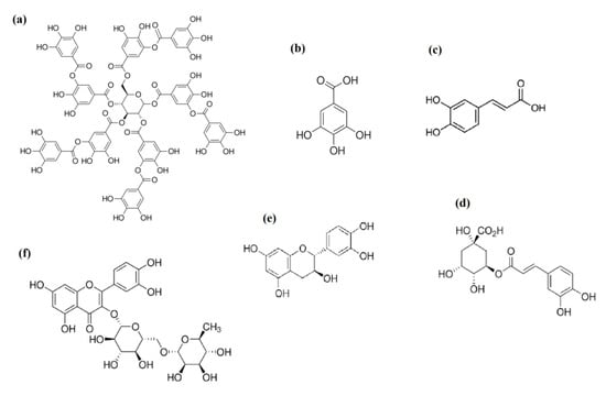 Chemical structures of identified phenolic compounds in PR varieties extracts; (a) tannic acid; (b) gallic acid; (c) caffeic acid; (d) chlorogenic acid; (e) catechin; (f) rutin.