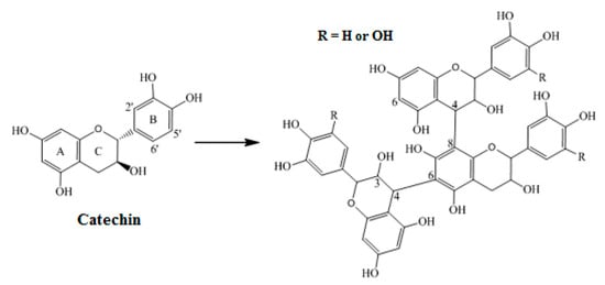 Polymerization of catechin monomer to a general structure of condensed tannins.