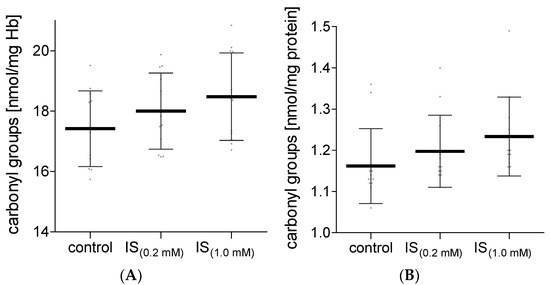 The levels of the carbonyl compound in hemolysate (A) and plasma (B) after incubation with IS. Data are expressed as mean ± standard deviation, n = 12. Gray spots: values of single results.