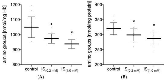 The levels of the free amino groups in hemolysate (A) and plasma (B) after incubation with IS. Data are expressed as mean ± standard deviation, n = 12, * p < 0.05—IS(0.2 mM) and IS(1.0 mM) vs. control. Gray spots: values of single results.