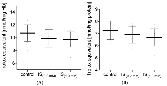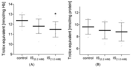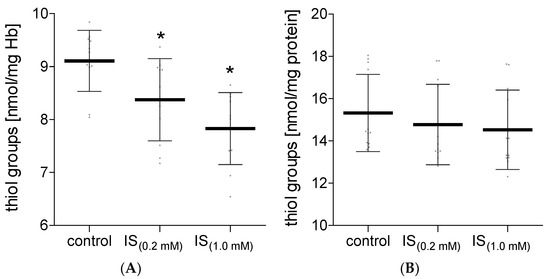 The levels of the free thiol groups in hemolysate (A) and plasma (B) after incubation with IS. Data are expressed as mean ± standard deviation, n = 12, * p < 0.05—IS(0.2 mM) and IS(1.0 mM) vs. control. Gray spots: values of single results.