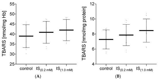 The levels of TBARS in hemolysate (A) and plasma (B) after incubation with IS. Data are expressed as mean ±standard deviation, n = 12. Gray spots: values of single results.
