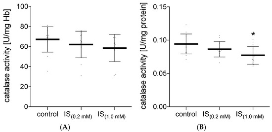 Alterations in the catalase activity in hemolysate (A) and plasma (B) after incubation with IS. Data are expressed as mean ± standard deviation, n = 12, * p < 0.05—IS(1.0 mM) vs. control. Gray spots: values of single results.