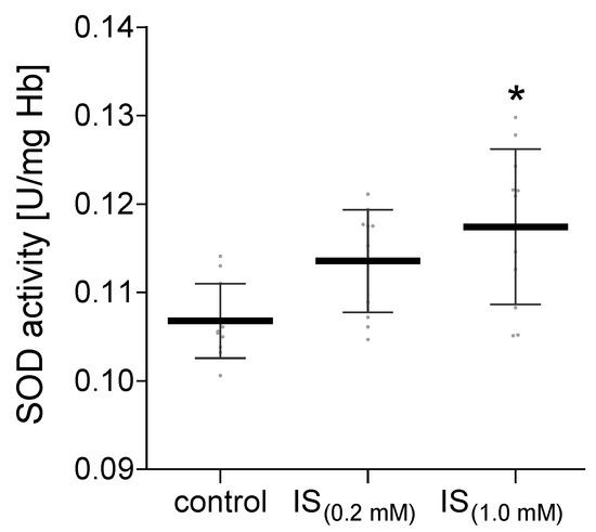 Alterations in the SOD activity in hemolysate after incubation with IS. Data are expressed as mean ± standard deviation, n = 11, * p < 0.05—IS(1.0 mM) vs. control. Gray spots: values of single results.