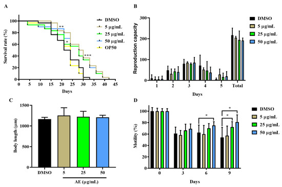 First, the effect of AE on the lifespan of N2 worms was investigated by determining the survival of AE-treated (5, 25 and 50 µg/mL) and non-treated worms. As shown in Figure 1A, the survival rate of AE-treated worms significantly increased compared to the control group, 5% DMSO. Additionally, the survival of worms in the control group was compared to that of worms fed with E. coli OP50—only to ascertain if there were any notable effects from the use of DMSO on the worms. No significant differences were observed in the survival of worms treated with DMSO and E. coli OP50 food (Figure 1A, Table S2). Some researchers have claimed that longevity can be achieved with dietary restrictions [23]. Hence, the possibility of AE-treated worms starving to achieve longevity was investigated in addition to whether treatment with AE posed any physical damages or changes to the worms. Here, reproduction capacity, body length and motility determination were employed as indicators for health span. It was found in Figure 1B that AE supplementation did not significantly change both the daily and the overall fertility of worms. In the body length determination (Figure 1C), it was also observed that worms fed well with no physical changes in length just like the control group. In Figure 1D, 25 µg/mL and 50 µg/mL AE treatment enhanced muscle movement as worms aged: day 6 and day 6 and 9 respectively. On the contrary, this effect was not seen in 5 µg/mL AE-treated and control worms. Based on these effects, AE concentration of 50 µg/mL was selected as the most consistent and effective concentration for further analysis.
