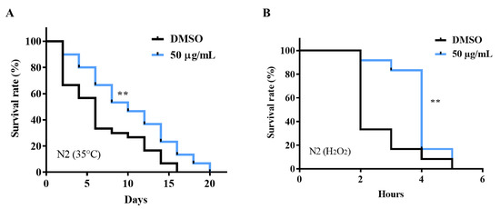 Effect of AE treatment on stress tolerance of wild type C. elegans. Worms were cultured on NGM-OP50 plates containing DMSO or AE (50 µg/mL) at 20 °C for 96 h. (A) Heat stress survival of worms exposed to heat at 35 °C for 7 h (n = 30 worms/group) (B) Oxidative stress survival of worms exposed to 0.1% hydrogen peroxide (n = 12 worms/group). Statistical differences compared to control (DMSO) were considered significant at ** p < 0.01 by log-rank test. Data shown are representative of triplicate determinations.