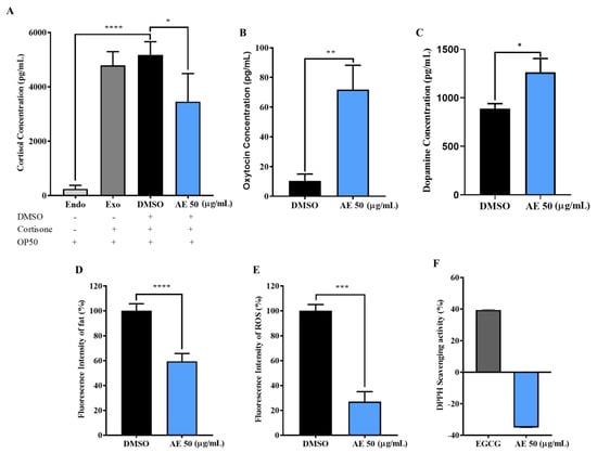 When an organism is exposed to stress, several hormones, neurotransmitters and other biological markers become erratic. Thus, this affects normal physiological functioning which can lead to stress-induced diseases and disorders [24,25]. To determine how AE regulates stress biomarkers, the levels of stress hormones, cortisol, oxytocin and dopamine, in addition to fat and ROS accumulation in C. elegans were investigated. In Figure 3A, the low production of cortisol (Endo) by the worms depicted that, endogenously, C. elegans (~3000 worms) were unable to produce enough cortisol for analysis using ELISA. Hence, the addition of 17.5 mM Cortisone. Cortisone is an inactive substrate which is converted to cortisol through the enzymatic activities of the 11β-HSD 1 enzyme [26]. It was observed, after additional cortisone treatment in Exo (E. coli OP50 fed worms; positive control), DMSO and 50 µg/mL groups that had AE treatment had significantly reduced cortisol levels compared to the control groups (Exo and DMSO). Thus, this suggests that AE may possess the ability to inhibit the activities of the 11β-HSD 1 enzyme. Interestingly, as shown in Figure 3B,C, AE treatment significantly increased oxytocin and dopamine levels, respectively. This also suggests that AE is essential to increase social bonding, interactions and pleasure. A common stress associated disease/disorder is obesity, characterized as the excessive accumulation of fat due to irregular eating patterns caused by stress [27]. In Figure 3D, it was observed that AE treatment significantly reduced fat in worms compared to the control group, depicting that AE may be effective in controlling obesity. Additionally, in Figure 3E, AE supplementation in worms showed a significant reduction in the accumulation of intracellular ROS. However, AE was ineffective in scavenging ROS in vitro (Figure 3F). Thus, this implies that AE possibly does not possess inherent antioxidant activity.