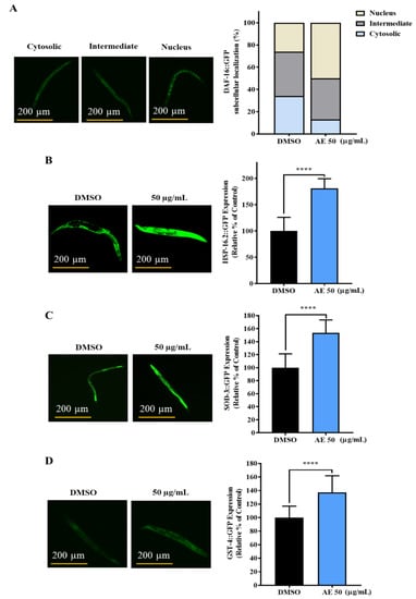 Effects of AE on DAF-16 cellular translocation and the expression of HSP-16.2, SOD-3 and GST-4 in GFP-tagged worms. (A) Subcellular localization of DAF-16::GFP worms treated with or without AE (50 µg/mL) for 96 h (n = 30 worms/group). Subcellular localization was categorized into Cytosolic, Nucleus and Intermediate (between cytosolic and nucleus). (B) HSP-16.2::GFP worms treated or not treated with AE were cultured for 72 h and exposed to heat shock at 35 °C for 2 h (n = 30 worms/group). (C) SOD-3::GFP and (D) GST-4::GFP AE-treated and non-treated worms were cultured for 72 h (n = 30 worms/group). Statistical differences compared to control (DMSO) were considered significant at **** p < 0.001 by Student’s t-test. Data were represented by mean ± SD. Experiments were performed in triplicate determinations and representatives shown. Scale bar for GFP analysis = 200 µm.