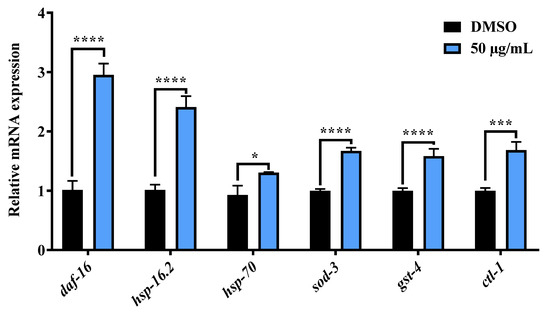Effects of AE on the mRNA expression daf-16 and its target genes in wild type C. elegans. Worms were cultured at 20 °C on NGM-OP50 plates, treated with or without AE (50 µg/mL) for 96 h (n ≈ 500 worms/group). Statistical differences compared to control (DMSO) were considered significant at * p < 0.05, *** p < 0.005 and **** p < 0.0001 by multiple t tests. Data were represented by mean ± SD. Experiments were performed in triplicate determinations.