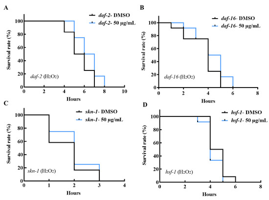 Effect of AE on the oxidative stress survival of C. elegans mutants. Worms were cultured at 20 °C on NGM-OP50 plates, treated with or without AE (50 µg/mL) for 96 h. (A) daf-2 (e1370) mutants, (B) daf-16 (mgDf50) mutants, (C) skn-1 (tm4241) mutants and (D) hsf-1 (sy441) mutants oxidative stress survival (n = 12 worms/group). Statistical significances of survival curves were assessed by log-rank test. Experiments were performed in triplicate determinations and representative curves shown.