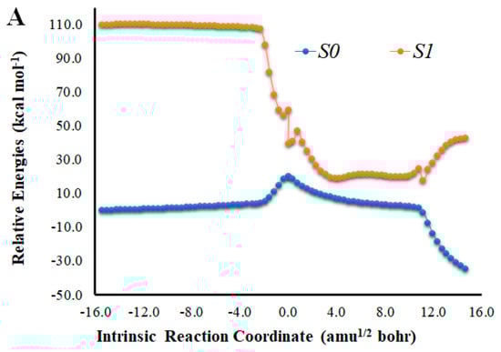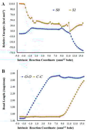 The analysis of the S0 and S1 potential energy curves for Cl-Diox-OH (Figure 1) shows that the introduction of a Cl− species into the system does affect its singlet chemiexcitation profile. While the S0 biradical PEC region is indeed flat to a significant extent (length of ~10 amu1/2 bohr), the S0 and S1 are not as degenerated in that region as in the case of Diox-OH [36]. That is, except for three values of coordinates, the S0–S1 energy gap is always higher than 13.0 kcal mol−1. Nevertheless, Cl-Diox-OH still presents three values of coordinates in which the S0–S1 energy gap is relevantly low, which are as follows: 4.9 kcal mol−1 at 9.0 amu1/2, 10.3 kcal mol−1 at 9.4 amu1/2 bohr, and 8.7 kcal mol−1 at 11.6 amu1/2 bohr.