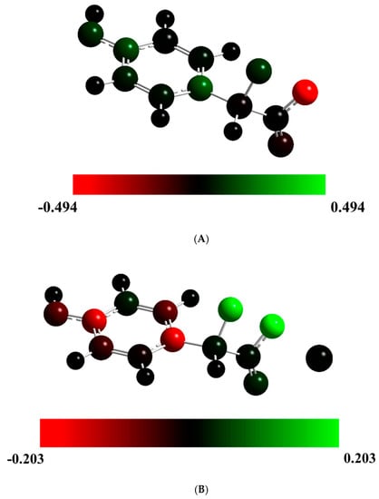 To evaluate the potential trigger of ET by the ionic species, we present, in Figure 3, the Mulliken spin density for the TS structures of Cl-Diox-OH and Na-Diox-OH. It should be noted that for Diox-OH [36], the spin density was located solely on the two oxygen heteroatoms that composed the peroxide bond, indicative of the biradical being formed due to homolytic O-O bond breaking (typical of neutral dioxetanones). Interestingly, the Mulliken spin density of Cl-Diox-OH was delocalized between one of the two oxygen heteroatoms of the peroxide and the phenol moiety, indicating that placing a Cl− species does trigger ET from the electron-rich moiety to the peroxide (thereby introducing CIEEL character to the S0 thermolysis). The Mulliken spin density is somewhat different for Na-Diox-OH, as both oxygen heteroatoms that constituted the peroxide bond possess spin density. Nevertheless, they are of the same spin, with the spin density of the opposite sign being placed in the phenol moiety. Therefore, the placement of the Na+ species also induces CIEEL characteristics in the S0 thermolysis of Na-Diox-OH.