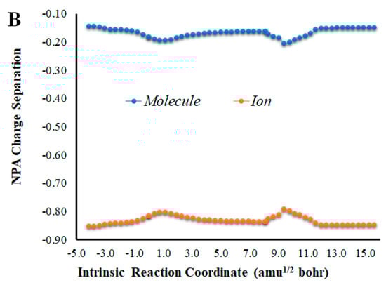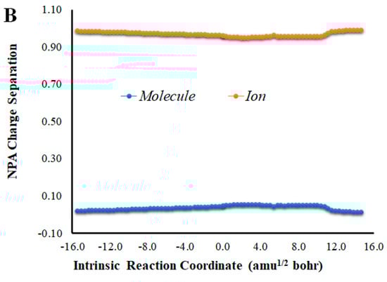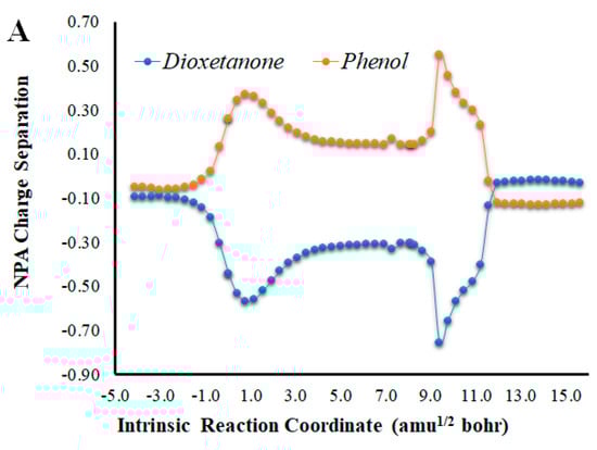 Given that placing the ionic species in the vicinities of Diox-OH triggered ET from the phenol to the peroxide, we also evaluated if those species could induce CT. To that end, we calculated the NPA charge separation between the phenol and cyclic peroxide moieties for the two systems (Figure 4 and Figure 5) as a function of intrinsic reaction coordinates. It should be noted that the thermolysis of Diox-OH proceeded without relevant CT [36]. In contrast to Diox-OH, the thermolysis of Cl-Diox-OH proceeds with relevant CT in the vicinity of the biradical TS, associated with peroxide bond breaking, with a charge separation between the dioxetanone and phenol moieties of 0.94e (Figure 4). Thus, placing a Cl− species near the phenol also triggers relevant CT during peroxide bond breaking, providing CTIL characteristics to this reaction. The same can be said for Na-Diox-OH (Figure 5), as an even higher charge separation (of ~1.5e) was found. Interestingly, the charge separation profiles present relevant differences between systems. For Cl-Diox-OH (Figure 4), we observed an initial CT in the vicinity of the TS, with a return to somewhat basal charge separation values until the rupture of the peroxide was reached, in which further CT/BCT was achieved. This latter CT/BCT, associated with final peroxide rupture, is not uncommon for neutral dioxetanones [36]. However, in the case of Na-Diox-OH, there is an initial CT with peroxide bond breaking at the TS, but subsequent BCT only occurs with peroxide ring rupture (Figure 5). This profile is more typical of CTIL-based anionic dioxetanones [36]. We also evaluated the charge separation between the dioxetanone molecule and the ion for both Cl-Diox-OH (Figure 4) and Na-Diox-OH (Figure 5). While the presence of the ion does trigger CT within the dioxetanone molecule, relevant CT was not observed between the ion and the molecule for either case.