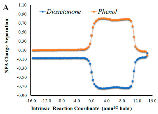 (A) NPA charge separation between the dioxetanone and phenol moieties of S0 Na-Diox-OH, as a function of intrinsic reaction coordinates. (B) NPA charge separation between the dioxetanone molecule and Na+ ion of S0 Na-Diox-OH, as a function of intrinsic reaction coordinates.