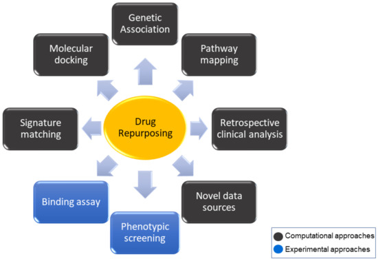 Computational techniques are valuable and stimulating tools useful for the identification of new potential drug candidates. In a typical drug discovery process, a large number of molecules are designed, selected/filtered out, synthesized, and biologically evaluated, in order to identify new promising bioactive compounds. This approach is time and cost consuming and often provides disappointing results [1]. In order to overcome this issue, drug repurposing computational-based strategies can be applied (Figure 1) [2,3]. Indeed, in silico methods represent excellent tools for the repositioning of different molecular platforms, including already approved drugs, natural products with unknown mechanisms, and newly synthesized compounds designed for a given target but not performing as expected.