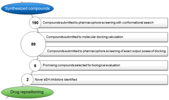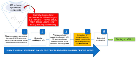 The workflow aimed at the repositioning of 190 in-house synthesized compounds and leading to the quinazolinedione-based compounds on sEH, as new inhibitors endowed with anti-inflammatory properties, is reported in Figure 2.