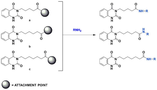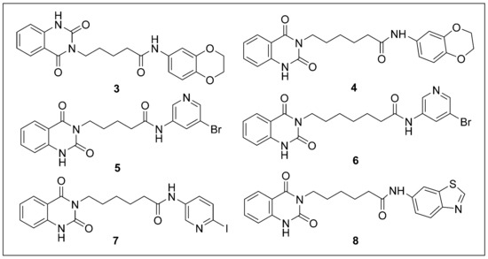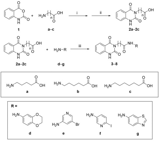 The synthesis (Scheme 1) of the selected compounds 3–8 (Figure 4), based on a dihydroquinazoline scaffold, started from the reaction of isatoic anhydride (1H-3,1-benzoxazine-2,4-dione), a suitable synthetic building block (1) with aminopentanoic/esanoic/eptanoic acid (a–c) in the presence first of triethylamine and then of formic acid to obtain the intermediates 2a–2c, respectively (Scheme 1) [31,32].