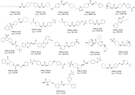 2D structures of known sEH inhibitors co-crystallized selected for the development of the 3D structure-based pharmacophore models, featuring their relative PDB code and IC50 values [44,46,47,48,49,50,51,52,53,54,55,56,57,58,59,60,61,62].