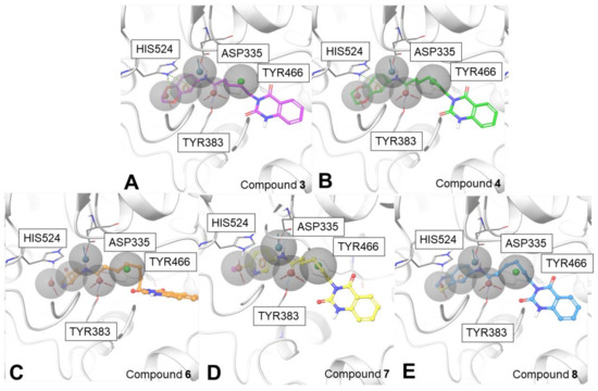 Docking poses related to five of the six accounted compounds matched all the five pharmacophoric points inside the protein counterpart, namely compounds 3, 4, 6, 7 and 8 (Figure 8). In Table 1, for each investigated compound, the following parameters are reported: (a) the number of matched features (i.e., Num Sites Matched in Table 1), (b) the PhaseScreen score, which indicates a measure of how well the molecule fits within the pharmacophoric model, and (c) the docking score, which indicates the extent of binding established between the ligand and protein counterpart.