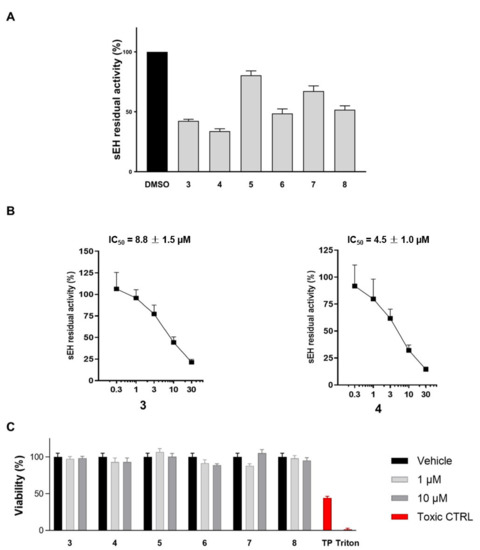 (A) sEH residual activity after treatment with compounds 3–8 at 10 μM (DMSO is the positive control); (B) Concentration-response curve for sEH inhibition by compounds 3 and 4. The enzyme was incubated for 15 min with compounds 3 and 4 at different concentrations (from 0.3 µM up to 30 µM) or vehicle (1% DMSO); (C) Cell viability assays for 3–8 on peripheral blood mononuclear cell (PBMC).