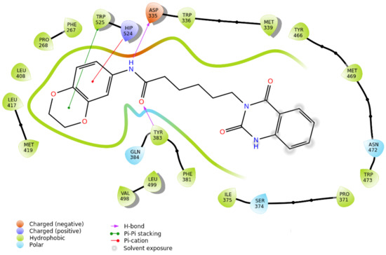 Using CombiGlide software (version 4.4), a library of 8772 compounds was generated, considering 2924 commercially available aromatic amines, according to the synthetic route reported in Scheme 1. Subsequently, LigPrep was applied for the generation of all possible tautomers, stereoisomers, and protonation states at physiological pH, while QikProp [66,67] (version 5.1, Schrödinger Suite, Schrödinger, Inc., New York, NY, USA) was employed to predict the pharmacokinetic parameters for each item of the libraries. After that, the new library was filtered using LigFilter (KNIME AG, Zurich, Switzerland), according to the Lipinski filter, to prioritize drug-like compounds, and, finally, 3693 compounds were selected for the subsequent molecular docking calculations.