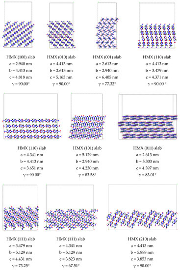Binding energy (ΔE) between crystal surface is a measure of the inter-planar action of crystal, where a low, positive value indicates a weak interaction between the crystal surfaces. We built periodic supercell (4 × 4 × 4) bulks of RDX and HMX and cleaved different crystal surface in the bulk RDX and HMX, finally, we rebuilt periodic supercell (4 × 1 × 4) with a vacuum thickness of 20 Å. The structure of RDX and HMX slabs is shown in Figure 1. The optimization of the RDX and HMX bulks and slabs was calculated by a classical force field simulation method in the Forcite module [28] with COMPASS force field [29]. The structures were relaxed with the following thresholds for the converged structure: energy change per atom was less than 1.0 × 10−5 eV, residual force was less than 0.03 eV/Å, the displacement of atoms during the geometry optimization was less than 0.001 Å, and the residual bulk stress less than 0.05 GPa. We calculate the ΔE in a slab model according to Formula (1):