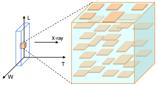In the SAXS patterns of RDX, strong streak was found from the front side. It shows that the crystal defects in RDX single crystal are lamellar or rod-like with preferred orientation. To confirm the crystal defects shape, the SAXS patterns from different directions were obtained by rotating the sample stage. The streak did not disappear during the horizontal direction orientation but disappeared during the vertical direction orientation, which illustrates that the nano-scale defects are lamellar structure along the horizontal direction. The SAXS scattering signal shows obvious orientation, indicating the lamellar defects in RDX single crystal are parallel to each other. According to the results, the nano-sized defects in RDX single crystal are a lamellar structure distributing along the same direction, as schematized in Figure 3.