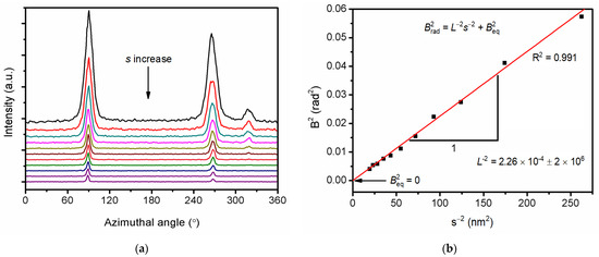 By integrating SAXS data along the azimuth Angle (Figure 5a), the half-peak width Brad corresponding to different scattering vectors s was obtained, and Brad2 was used to plot s−2 (Figure 5b), so that the average diameter of the lamellar single crystal was 66.4 nm, while Beq = 0 indicated that all the lamellar defects were completely parallel to each other.