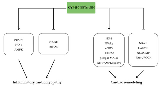 Inflammatory cardiomyopathy is defined as inflammation of the heart muscle associated with impaired function of the myocardium that has infectious and noninfectious causes [35]. The key pathophysiological mechanisms of inflammatory cardiomyopathy are considered as serious immune and inflammatory responses, which downregulated the expression of CYP450 and upregulated the expression of sEH, leading to decreased level of EETs [13]. Moreover, we found that glucocorticoids alleviated viral myocarditis, hemodynamic disorders, and cardiac dysfunction, and these protective effects were highly correlated with elevated levels of cardiac EETs [36], suggesting a potential anti-inflammatory effect of EETs in inflammatory cardiomyopathy. In line with these findings, EETs alleviated lipopolysaccharide (LPS)-induced myocardial injury and cardiac dysfunction and promoted the transformation of M1-type macrophages into M2-type macrophages. The specific molecular mechanism was that EET inhibited nuclear factor-κB (NF-κB) activity through PPARα/γ and HO-1 signaling pathway [16]. These results suggest that increasing the activity or expression of CYP450 represents a novel approach to alleviate inflammatory cardiomyopathy caused by infectious factors, such as viral myocarditis and septic cardiomyopathy.