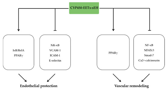 Vascular remodeling is an active process of altering structure regulated by the dynamic interaction of locally generated growth factors, inflammatory cytokines, vasoactive substances, and hemodynamic stimuli [65]. Atherosclerosis is a common type of vascular remodeling characterized by inflammation and lipid deposition within the arterial wall, leading to plaque formation [66]. Study showed that sEH inhibition reduced circulating level of LDL by 30%, increased level of HDL by 43%, and elevated the HDL to LDL ratio by 96% [67]. Overexpression of CYP2J2 in mice with an elevation of EETs level reduced low-density lipoprotein and elevated high-density lipoprotein levels by activating PPAR-γ receptor [15], which is considered as a classical anti-inflammatory pathway. These effects suggest EETs have a great potential in preventing atherosclerosis and the coronary artery diseases. Consistently, either specific expression of CYP2J2 in ApoE−/− mice or pharmacological inhibition of sEH significantly increased levels of EETs in mice and subsequently delayed the progression of atherosclerosis by decreasing the expression of adhesion molecules and the level of inflammatory cytokines [68,69,70]. EETs derived from endothelial CYP2J2 overexpression or sEH inhibition reduced adhesion factors expression including ICAM-1, VCAM-1, and suppressed macrophage infiltration, and inflammatory factors release [71]. Accumulative evidence revealed that sEH gene deletion alleviated atherosclerosis by reducing macrophages infiltration [72]. Pharmacological inhibition of sEH by TPPU treatment firmly reduced ER stress and alleviated atherosclerosis caused by endothelial Nox4 dysfunction [73], which is considered as a major determinant of atherosclerosis under atherosclerosis-prone conditions [74]. Abdominal aortic calcification is considered as a marker of coexistent atherosclerotic disease. Recent studies indicated that primary aldosteronism (PA) patients exhibited more severe abdominal aortic calcification (AAC), which is accompanied by higher serum levels of 14,15-DHET. On the contrary, decreased 14,15-EET was significantly associated with AAC prevalence in PA patients [75]. Above all, EETs and sEH inhibition decrease inflammation and have vascular protective actions that can combat atherosclerosis.
