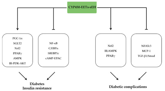 Type 2 diabetes (T2DM) is a metabolic disease characterized by insulin resistance, β-cell dysfunction, and increased hepatic glucose production [95,96]. A growing body of evidence indicated that CYP450-EETs-sEH pathway regulated insulin resistance and therefore prevented the development of T2DM. Mice with gene knockout of Cyp2c44 exhibited significant decreased insulin sensitivity in peripheral tissue [97]. CYP2J3 overexpression in db/db mice improved insulin resistance, decreased endoplasmic reticulum stress by activating the AMPK and insulin receptor (IR)-PI3K-AKT signaling pathway [98,99]. Similar effects were observed in diabetes rat models with CYP2J3 overexpression, and the protective effects were associated with increased level of nitric oxide synthase in endothelial cells [93]. CYP2J2 overexpression-derived EETs or treatment with exogenous EETs also improved insulin resistance, increased glucose uptake and restored glucose homeostasis by activation of PPARγ [100]. Consistent with the effects of CYP450 overexpression, a dual EET agonist/soluble epoxide hydrolase inhibitor to HO-2-null mice increased EET levels and consequently increased insulin sensitivity and decreased serum inflammatory cytokines TNF-α and MCP-1 [101]. Although adipose tissue is a primary site of inflammation in T2DM, the role of inflammation in other metabolic active tissues, such as the liver, remains substantial in the development of T2DM. CYP2J2 overexpression alleviated hepatic inflammation, including reduced production of proinflammatory cytokines and decreased the infiltration of macrophages in the liver, which attenuated metabolic dysfunction in diabetic mice [100]. Additionally, the upregulation of SGLT2 expression via inhibiting NF-κB signaling pathway in renal tubular epithelial cells mediated the attenuation of insulin resistance by 14,15-EET [102].