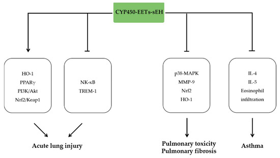 In a tobacco smoke-exposed rat model, sEH inhibitor markedly reduced the number of neutrophils, macrophages, and lymphocytes in bronchoalveolar lavage [127]. Meanwhile, sEH inhibition or knockout alleviated the lung inflammation, emphysematous changes, and improved lung function by reducing IFN-γ and vascular remodeling-related growth factor [128,129]. In vitro experiments showed that cigarette smoke extract (CES) inhibited the expression of CYP2C8 and increased expression of sEH [130]. In turn, 11,12-EET or 14,15-EET treatment reduced the CES induced interleukin-8 production in bronchial epithelial cells by inhibiting the phosphorylation of p38 MAPK pathway [130]. Consistently, treatment with 14,15-EET reduced the release of inflammatory cytokine IL-6, IL-8, and MCP-1, accumulation of Nrf2 and expression of HO-1 in human bronchial epithelial cell [131].