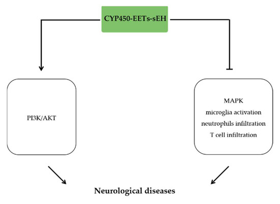 Neurological diseases are a series of multi-factorial diseases accompanied with proceed neuronal cell death and brain damage, in which neuroinflammation plays a key role [137]. Ischemic stroke results in neurological injury, accumulating evidence indicated that EETs derived from CYP450 overexpression or sEH inhibition protected brain against the ischemic injury by inhibiting inflammatory-related pathological process [138,139,140,141,142]. CYP2J2 overexpression decreased cerebral infarct size and increased brain perfusion by activation of the PI3K/AKT signaling pathway [138]. In the rat MCAO model, treatment with AUDA or 14,15-EET effectively promoted angiogenesis, reduced astrogliosis and neuronal apoptosis, as well as suppressed microglia activation and inflammatory response [140]. In spinal cord injury rat model, treatment with AUDA markedly reduced local inflammatory response, which is associated with reduced microglia activation and IL-1β expression, as well as the decreased infiltration of neutrophils and T lymphocytes [141]. In the context of central post-stroke pain (CPSP), administration of TPPU attenuated ER stress and MAPK signaling, and therefore reduced microglia and astrocytes activation in rat [142] (Figure 7).