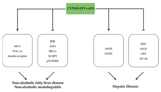 Non-alcoholic fatty liver disease (NAFLD) and non-alcoholic steatohepatitis (NASH) is linked to liver inflammation as well as hepatocyte death [143]. A growing body of evidence indicated that NAFLD is accompanied with downregulated CYP450 expression, enhanced sEH activity and reduced EETs concentration [144], suggesting the crucial roles of AA-CYP450-EETs-sEH in pathophysiology of NAFLD. sEH inhibition or deletion significantly decreased liver inflammation, including attenuation of macrophage accumulation and reduction of inflammatory response and ER stress. These protective effects were associated with inhibition of JNK, p38 PERK, IRE1α, and ATF6 signaling pathway [145,146]. In line with the effects of sEH gene knockout, administration of EET analogues reduced hepatic fibrosis, insulin resistance, and inflammation induced by HFD, which is associated with an increase in HO-1-PGC1α and enhanced insulin receptor phosphorylation [147]. COX-2/sEH dual inhibitor PTUPB relived high-fat diet induced non-alcoholic fatty liver disease via inhibiting NLRP3 inflammasome activation in mice [148].