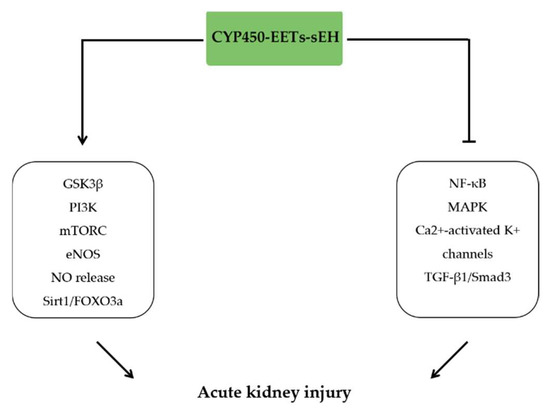 The CYP450-EETs-sEH system is important in preventing kidney damage caused by inflammation. EETs derived from CYP2J2 overexpression protected I/R-induced rat acute kidney injury (AKI) through activation of autophagy by upregulating the Sirt1/FOXO3a signaling pathway [153]. Previous findings have indicated that 14,15-EET increased the p-eNOS and NO release by blocking the Ca2+-activated K+ channels, which caused afferent arteries dilatation and reduced renal inflammation [154]. Intraperitoneal injection of 14,15-EET also decreased I/R-induced mice AKI via relieving renal tubules dilation by increasing GSK3β phosphorylation and restoring p-GSK3β/GSK3β ratio [155]. Consistent with previous findings, sEH depletion and sEH inhibitor treatment has been reported to attenuate the renal inflammation and injury. sEH depletion alleviated interstitial inflammation and renal fibrosis by inhibiting the TGF-β1/Smad3 and NF-κB signaling, decreasing infiltration of neutrophils and macrophages and preventing ROS induced cell death in rat unilateral ureteral obstruction model [156]. In LPS-induced kidney injury model, podocyte sEH-deficient and TPPU treatment relieved kidney injury via reducing NF-κB and MAPK activation and attenuating ER stress [157]. Administration of sEH inhibitor nb-AUDA and AUDA also attenuated the renal injury in cisplatin-induced mice AKI model [158]. Similar to the effects of sEH depletion or inhibition, the 14,15-EET analog alleviated the I/R-induced AKI by reducing tubular apoptosis and inflammatory cell infiltration through increasing PI3K and mTORC2-related phosphorylation of Akt [18]. 14,15-EET analogue also alleviated the cyclosporine-induced rat renal dysfunction by inhibition of inflammatory cells infiltration into the kidney and reduction of renal fibrosis [159] (Figure 9).