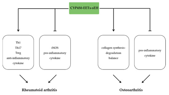 The anti-inflammatory effects of EETs in arthritis. EETs ameliorate rheumatoid arthritis by increasing Th1, Th17, Treg, and anti-inflammatory cytokines and reducing iNOS and pro-inflammatory cytokines. EETs ameliorate osteoarthritis by promoting collagen synthesis-degradation balance and reducing pro-inflammatory cytokines.