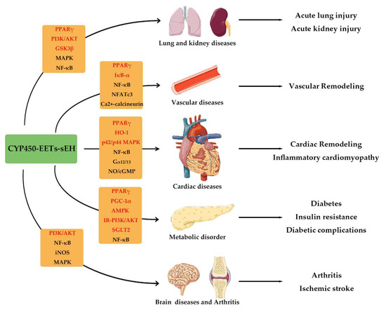 Rapid progress has been made in evaluating the roles of AA-CYP epoxygenase-EETs-sEH pathway in the pathophysiology of human diseases, of which anti-inflammatory actions have gained great recent interest. EETs exhibit potent protective effects on the prevalence of inflammation-related diseases, including cardiovascular remodeling, metabolic disorders, sepsis, lung injuries, neurodegenerative disease, hepatic diseases, kidney injury, and arthritis (Figure 11). Moreover, the EETs analog and sEH inhibitors also show the strong anti-inflammatory properties in many systematic illnesses, such as heart failure, diabetes, neuro-inflammatory pains, suggesting that pharmacological manipulations of AA-CYP450-EETs-sEH systems are of great potential in clinical applications.