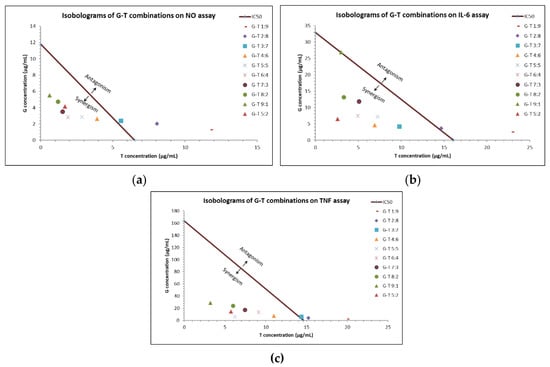 Interactions of G-T combinations (1:9, 2:8, 3:7, 4:6, 5:5, 6:4, 7:3, 8:2, 9:1, 5:2, w/w) in reducing LPS-induced NO, IL-6 and TNF in RAW 264.7 cells as analysed by isobologram. Isobologram of G-T combinations at IC50 on NO (a), IL-6 (b) and TNF (c) assays.