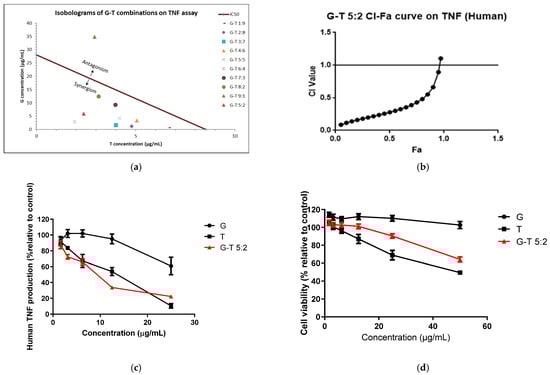 The TNF inhibitory effect of G (1.63–25 µg/mL) was insignificant, whereas T (1.63–25 µg/mL) showed a dose-dependent inhibition with an IC50 of 8.54 ± 1.43 µg/mL in THP-1 cells (Table 2 and Figure 2a).