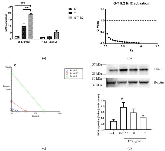 Up-regulatory effect of G, T and G-T 5:2 on Nrf2 and HO-1 protein levels (n ≥ 3). (a) G, T and G-T 5:2 induced Nrf2 luciferase at 25 and 12.5 µg/mL (n ≥ 3). ** p < 0.01 compared between G-T 5:2 and T at 25 µg/mL; ### p < 0.001 compared between G-T 5:2 and G at 25 µg/mL. (b) CI-Fa curve of G-T 5:2 in upregulating Nrf2 expression and strong synergy was observed at all tested concentration levels. (c) Isobologram of Nrf2 luciferase by G, T and G-T 5:2. (d) G-T 5:2 further strengthened the en-hancement of HO-1 protein expression as analysed by western blot analysis (n = 3). # p < 0.05 compared between G-T 5:2 and blank.